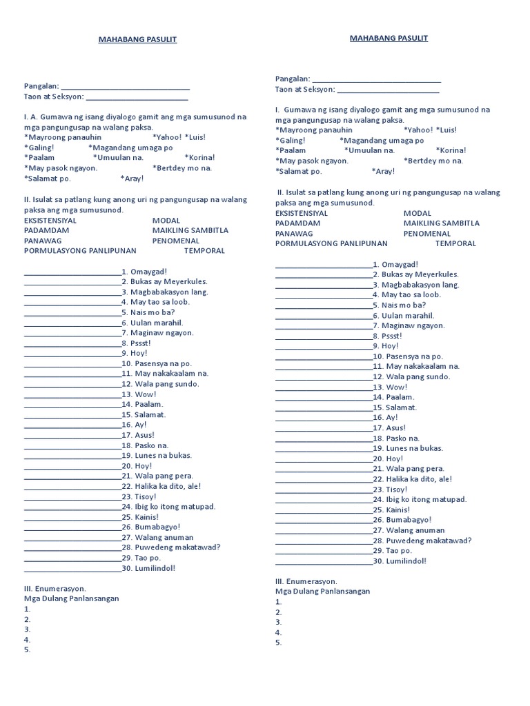 Ang tulang ito ay isang uri ng tulang pasalaysay na pakuwento na maaring mahaba na may kaugnayan sa isang kumplikadong pangyayari. Walang taong mahirap at walang taong mayaman lahat ay pantay-pantay sa mata ng panginoong diyos Ang isang pilosopiya ng mga tao sa mundo na naniniwalang lahat ng taong nabubuhay ay pantay-pantay. URI NG PANGUNGUSAP NA WALANG PAKSA 1EKSISTENSYAL -May bgay na umiiral sa himig totoo ng pangungusap sa tulong ng mga katgang may o mayroon.