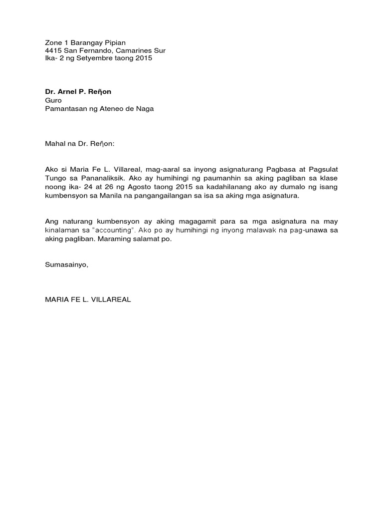 Liham Na Humihingi Ng Paumanhin Pdf