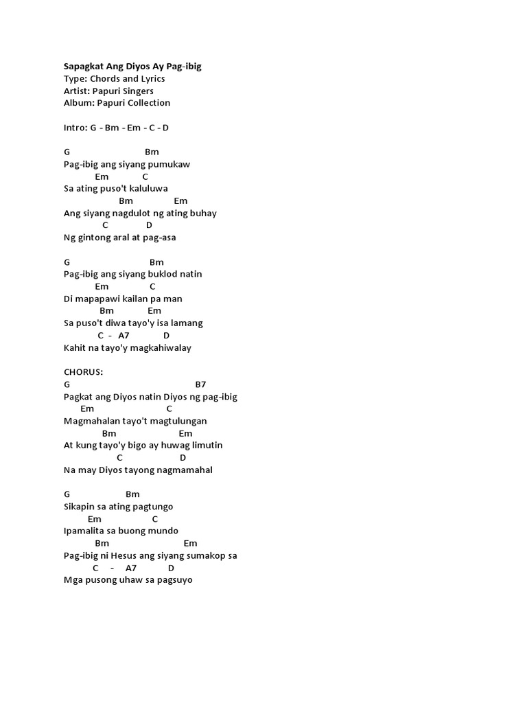 Lyrics of sapagkat ang diyos ay pag-ibig. B D F F F F bagsakan Pag - kat ang Diyos natin Diyos ng pag-ibig Bm G Magmahalan tayot magtulungan Fm Bm At kung tayoy bigo ay huwag limutin G. Sapagkat Ang Diyos Ay Pag-ibig Lyrics. Ang siyang nagdulot sa ating buhay.